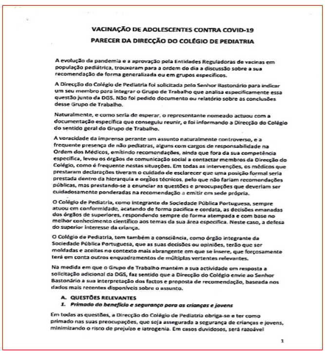 Primeira página do parecer de 21 de Julho de 2021 do Colégio de Pediatria da Ordem dos Médicos que foi ocultado e engavetado pelo então bastonário da Ordem dos Médicos, Miguel Guimarães, hoje deputado do PSD. O parecer só viu a luz do dia por intervenção do PÁGINA UM, através de uma intimação no Tribunal Administrativo de Lisboa.
