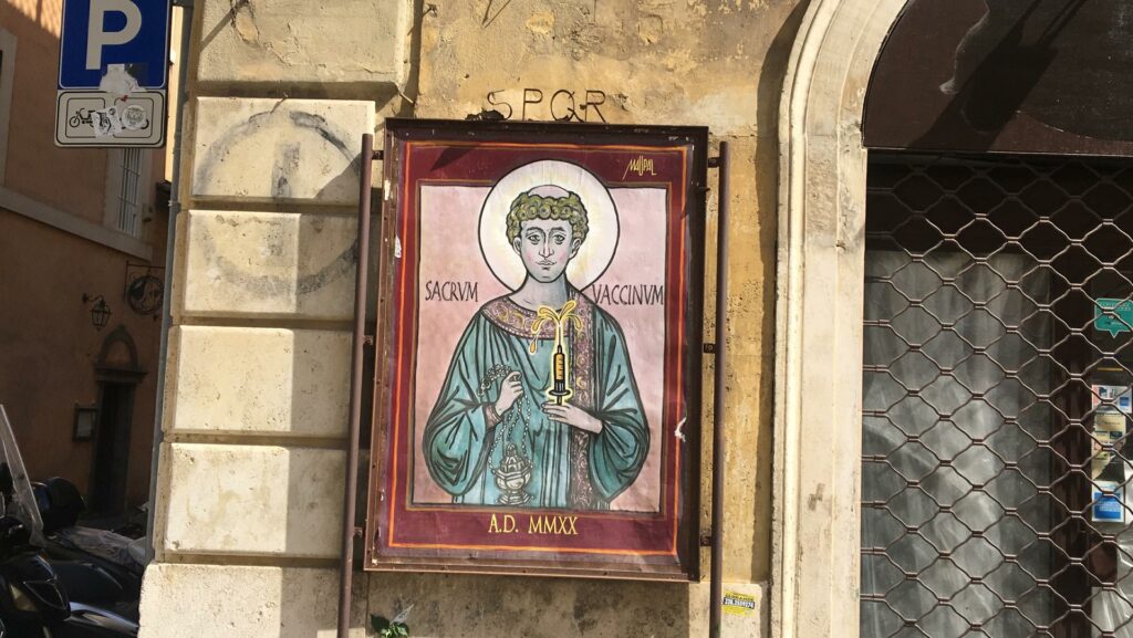 Na rua, a arte urbana ganhou um novo tema. Numa velha parede de esquina, alguém desenhou um quadro perfeitamente integrado. Nele a alusão à “Vacina Santa”, mesmo ao lado do Vaticano: são os sinais dos tempos.