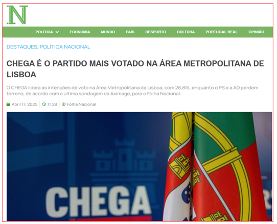 A ‘notícia’ da Folha Nacional – que, apesar de contar com mais de 90% de ‘takes’ da Lusa, publicada ainda uns artigos não assinados, e é considerado pela ERC um jornal – dá o CHEGA como vencedor destacado na AML, com 28,8% das intenções de voto, apoiando-se em apenas 116 inquiridos. Com esta quantidade, uma oscilação de meia dúzia de respostas bastaria para alterar radicalmente esse cenário.