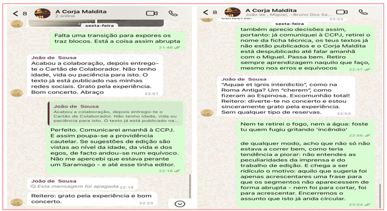 “Acabou a colaboração, depois entrego-te o Cartão de Colaborador. Não tenho idade, vida ou paciência para isto. O texto já está publicado nas minhas redes sociais. Grato pela experiência. Bom concerto. Abraço.”