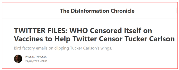 Ou seja, segundo Paul D. Thacker, “a OMS auto-censurou-se sobre as vacinas para ajudar o Twitter a censurar Tucker Carlson”.