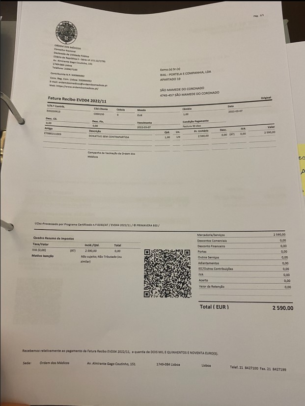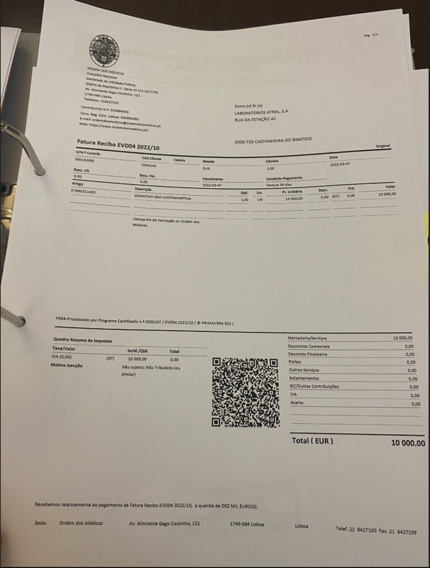 Factura/ recibo da Laboratórios Atral, uma das quatro em que se assume que o apoio financeiro para vacinar quase quatro mil médicos proveio de farmacêuticas. Contudo, o pagamento ao Hospital das Forças Armadas foi realizado pela conta solidária titulada (em nome individual) por Miguel Guimarães, Ana Paula Martins e Eurico Castro Alves.