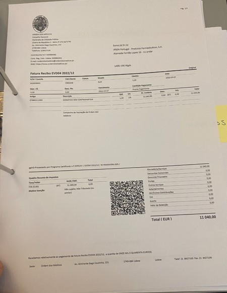 Três dias mais tarde, a Ordem de Miguel Guimarães passaria mais três facturas/ recibo a outras três farmacêuticas [vd., as ligações]: Ipsen Portugal (no valor de 11.040 euros), Bial (2.590 euros) e Laboratórios Atral (10.000 euros), também expressando que se trata de “donativo sem contrapartida” para a “campanha de vacinação da Ordem dos Médicos”.