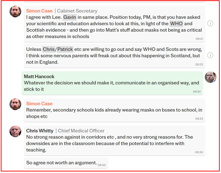 De acordo com as mensagens de WhatsApp gravadas por Hancock, o ministro foi informado em 20 de Novembro de 2020 por Chris Whitty que seria “muito bom” – isto é, bastaria – um período de cinco dias para os casos suspeitos (por contacto com infectados) “em vez” de isolamento de quinze dias. Nas mensagens, os dois concluem que o período de quarentena de 14 dias provavelmente foi “muito longo o tempo todo”. Até então, de acordo com o The Telegraph, quase um milhão de ingleses tinham sido instruídos, sob pesadas multas, a se auto-isolarem por quinze dias inteiros, mesmo que não apresentassem sintomas, se tivessem tido algum contacto de risco.