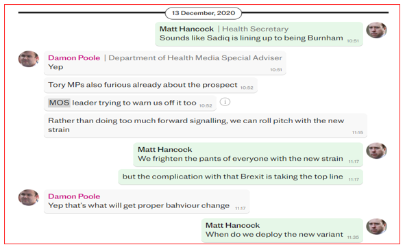Numa conversa no WhatsApp em 13 de Dezembro, obtida pelo The Telegraph, Damon Poole, um assessor de comunicação de Hancock – informou o seu chefe que os deputados conservadores já estavam “furiosos com a perspectiva” de medidas mais rígidas, pelo que a solução poderia passar por aproveitar uma nova estirpe que fora detectada na região de Kent.