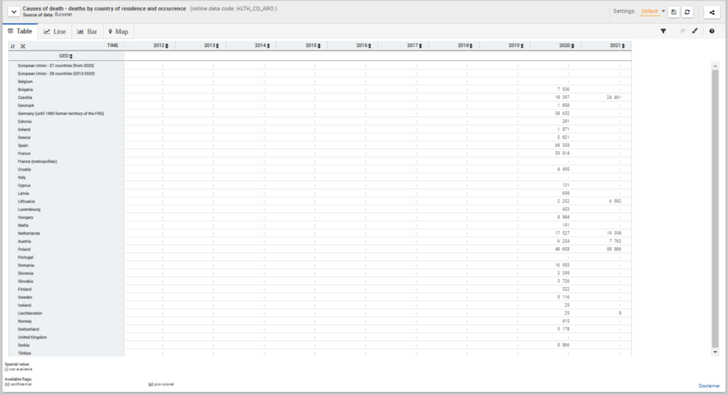 Quadro com as mortes atribuídas à covid-19 com confirmação laboratorial (U07.1). A base de dados do Eurostat permite pesquisa por qualquer doença letal por país e ano.