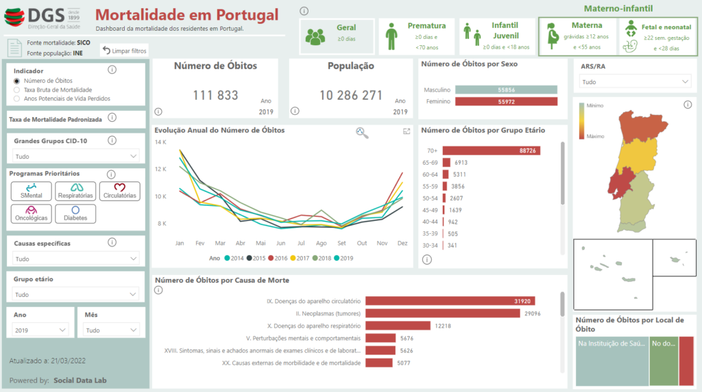 O Ministério da Saúde também implementou há anos um intuitivo sistema de consulta de dados sobre causas de morte por mês, grupos etários e região, permitindo algum cruzamento de outras variáveis. Mas essa denominada Plataforma da Mortalidade foi entretanto retirada em 2021, sem qualquer explicação da Direcção-Geral da Saúde, e reapareceu agora, sem pompa, mas ainda apenas com 2019 como último ano disponível. Recorde-se que estamos no ano de 2023.