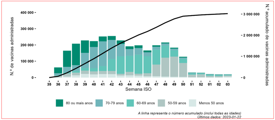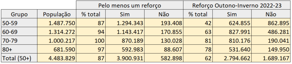 Embora as autoridades de saúde ainda tenham conseguido uma forte adesão dos maiores de 70 anos para a toma de mais uma dose, já se percepcionava um maior desinteresse ou mesmo desconfiança nos mais idosos. Comparando as taxas de vacinação entre o primeiro reforço (que em regra ocorreu entre finais de 2021 e inícios de 2022) e o agora reforço sazonal, observa-se uma queda de 19 pontos percentuais para os maiores de 70 anos. No caso dos maiores de 80 anos passou de 97% para 78%, enquanto no grupo dos 70 aos 79 anos desceu de 100% para 81%.