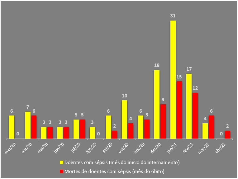 Em parte por ter sido um período crítico de internamentos, e de ainda estar em curso um problema de higienização, o mês de Janeiro deste ano foi aquele com maior número de internados por covid-19 que desenvolveram depois sépsis. No total contabilizaram-se 31 casos, mais 13 do que em Dezembro de 2020 e mais 14 do que em Fevereiro deste ano. Em Março e Abril, os casos passaram a ser pontuais. A partir desse período, o PÁGINA ainda não conseguiu obter mais dados.