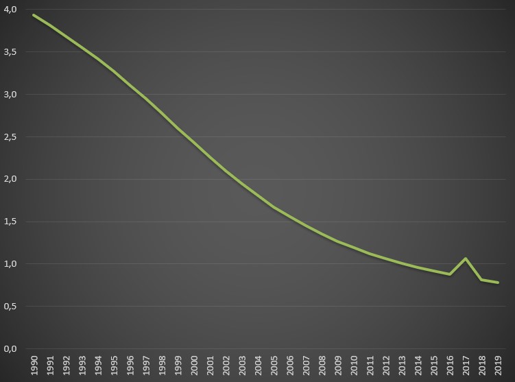Evolução da taxa de mortalidade (óbitos por 1.000 crianças com 5 anos) no grupo etário 5-14 anos em Portugal entre 1900 e 2019 (Fonte: UNICEF)