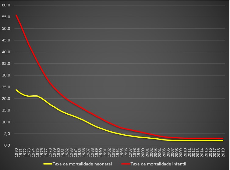 Evolução da taxa de mortalidade (óbitos por 1.000 nascimentos) neonatal e infantil em Portugal entre 1970 e 2019 (Fonte: UNICEF)