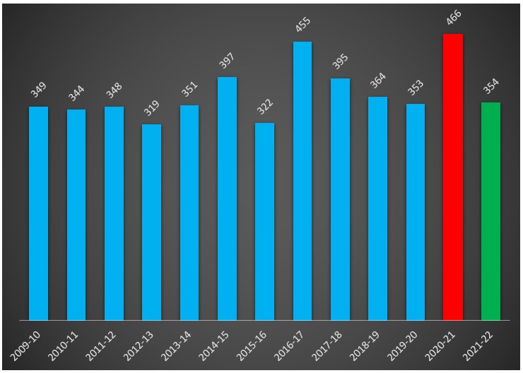 Mortalidade média diária por todas as causas entre 21 de Dezembro e 10 de Janeiro no período 2009-2010 até 2021-2022 (Fonte: SICO).