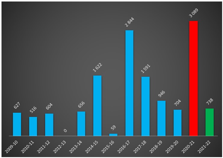 Variação absoluta da mortalidade total entre 21 de Dezembro e 10 de Janeiro no período 2009-2010 até 2021-2022, tendo como referência o período de menor actividade gripal (2012-2013) (Fonte: SICO).
