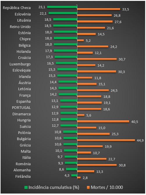 Segundo a Direcção-Geral da Saúde, estão actualmente infectados quase 265 mil portugueses, quando em igual período do ano passado rondava os 110 mil, ou seja, um aumento de cerca de 140%. Contudo, ao nível de óbitos atribuídos à covid-19, a situação é agora oposta: a média móvel da última semana é de 19 – com tendência estável –, enquanto há um ano atingia já os 104, e então com uma forte tendência de subida. No Inverno passado, de acordo com dados oficiais, chegou-se perto dos 300 óbitos por dia (média móvel) no pico da mortalidade por covid-19.