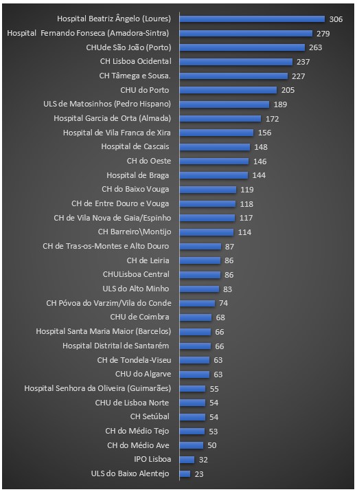 Nos centros hospitalares com mais de 500 doentes-covid durante os primeiros 15 meses da pandemia, nove registaram mais de 10% de internados-covid com “versão” nosocomial: Centro Hospitalar do Oeste (13,1%), Hospital Beatriz Ângelo (12,8%), Unidade de Saúde Local de Matosinhos, que agrega o Hospital Pedro Hispano (12,5%), Centro Hospitalar da Póvoa do Varzim/Vila do Conde (12,4%), Centro Hospitalar Universitário de São João (11,9%), Centro Hospitalar Lisboa Ocidental (11,7%), Hospital Garcia de Orta (11,5%), Centro Hospitalar Universitário do Porto (11,3%) e Hospital de Cascais (10,3%).