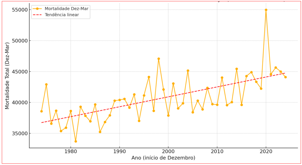 De facto, os dados das últimas cinco décadas apontam para um crescimento consistente da mortalidade no quadrimestre Dezembro-Março, com uma subida média anual de cerca de 160 mortes, mesmo considerando os picos de mortalidade entre 2020 e 2022, decorrentes tanto da mortalidade por covid-19 como pela gestão da pandemia. Esta evolução tem raízes sobretudo na alteração da estrutura etária da população portuguesa, cada vez mais envelhecida, e nas condições de saúde associadas a essa realidade.