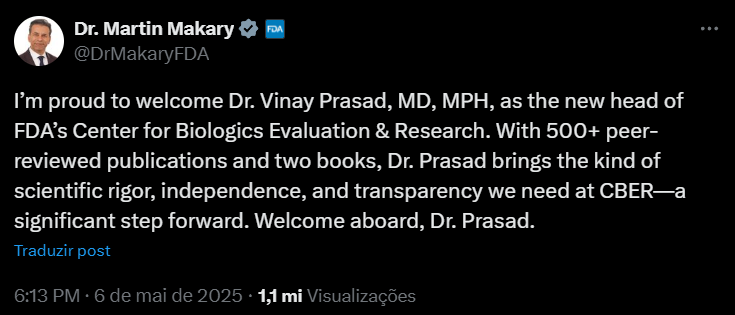 Martin Makary, que lidera a FDA, anunciou na rede X a escolha de Vinay Prasad para liderar a regulação de vacinas e fármacos biológicos. / Foto: D.R.
