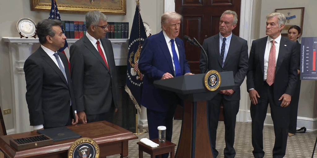 (Da esquerda para a direita) Martin Makary, líder da FDA, Jay Bhattacharya, responsável pelo NIH, o presidente dos Estados Unidos, Donald Trump, Robert F. Kennedy Jr, secretário de Saúde e Mehmet Oz, líder do Centers Medicare and Medicaid Services (o programa federal de seguro de saúde) na conferência de imprensa de hoje a propósito da ordem executiva que Trump assinou para baixar o preço dos medicamentos no país. / Foto: Captura de imagem a partir de vídeo da conferência de imprensa .