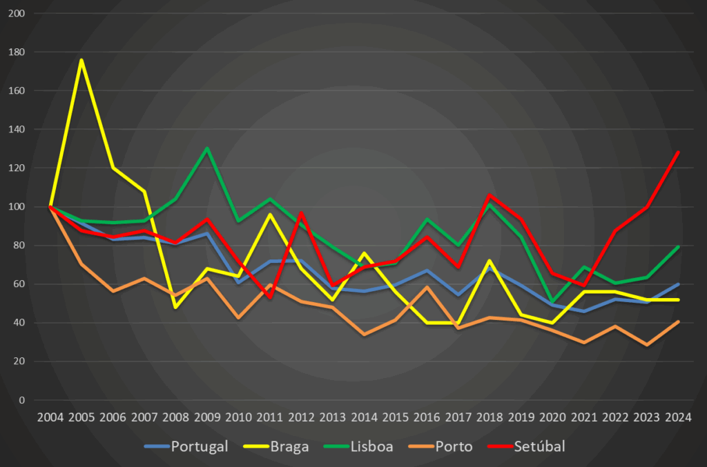 Evolução relativa da mortalidade infantil entre 2004 e 2024 em Portugal e nos distritos de Braga, Lisboa, Porto e Setúbal, tomando o ano de 2004 como valor base (índice 100).Fonte: INE. Análise: PÁGINA UM. Nota: Cada linha representa a variação percentual anual face ao valor de referência de 2004, pelo que valores acima de 100 representam um acréscimo e abaixo de 100 uma redução.