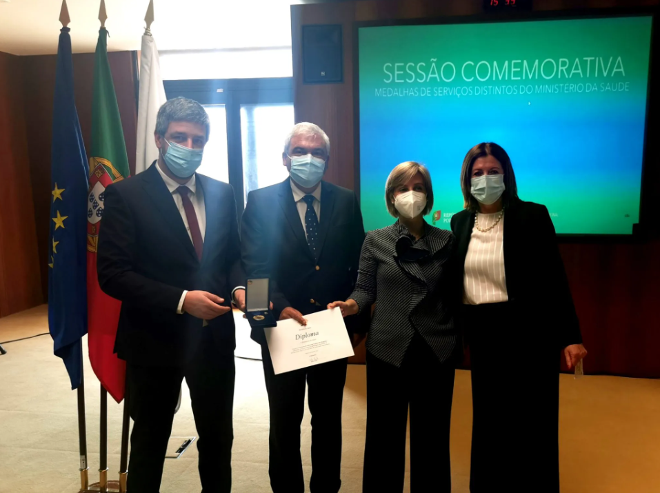 (Da esquerda para a direita) Joel Azevedo, administrador da SUCH, Paulo Sousa, presidente da SUCH, Marta temido, ex-ministra da Saúde, e Ana Maria Nunes, administradora da SUCH. A equipa executiva da SUCH foi reconduzida num despacho de Abril de 2022 pela então ministra da Saúde, Marta Temido (na foto, a segunda a contar da direita), e o ministro das Finanças, Fernando Medina. / Foto: D.R.