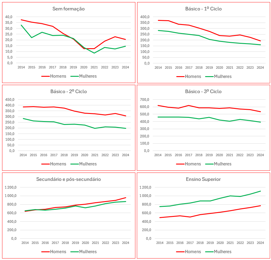O peso feminino na força de trabalho qualificada é inegável. Enquanto os homens continuam a ser maioria nos níveis de escolaridade mais baixos, as mulheres já dominam o ensino superior. No total, 40,5% das mulheres activas têm um grau académico superior, contra 27,8% dos homens. Em finais de 2024, esses valores eram, respectivamente, de 30,6% e 19,2%. Ou seja, o fosso entre os dois sexos ainda aumentou mais 1,3 pontos percentuais, favorável às mulheres.