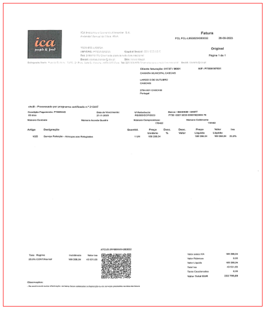 Para adensar a estranheza neste processo, acresceu a celeridade com que foi passada a factura pela ICA pelos alegados serviços de fornecimento de alimentação e também o rápido pagamento pelos serviços da Câmara Municipal de Cascais, ainda no decurso do prazo inicialmente previsto da execução do contrato. Com efeito. apenas dois dias depois da assinatura do contrato, ou seja, no passado dia 28 de Setembro, a ICA passou uma factura no valor total de 232.799,69 euros, desconhecendo-se, porque não foram apresentados quaisquer documentos oficiais, as razões para este novo valor. Nem tão-pouco se sabe a razão para o contrato ter decorrido durante 41 dias – e não 91 dias -, pois o contrato estabelecia um ‘tecto máximo’ de 307.500 euros. Além disso, no caderno de encargos nem sequer eram definidos os preços por unidade de refeição, ou seja, não se sabia sequer a quantidade total de pequenos-almoços, almoços, lanches e jantares.