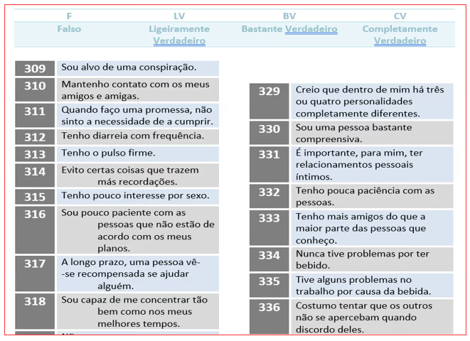 Há igualmente uma vertente quase caricatural na tentativa de detectar impulsividade ou descontrolo emocional, com itens como “Às vezes, expludo e perco o controlo sobre mim”, “Quando me enfureço, é muito difícil acalmar-me”, “Faço muitas coisas perigosas só pela emoção que me causam” ou “Quando estou a conduzir e me indigno com os outros condutores, faço para que deem conta disso”. E não faltam formulações de tom paranóide ou delirante, como “Algumas pessoas fazem coisas para me deixar mal”, “As pessoas que me rodeiam são leais comigo”, “Às vezes, misturo os pensamentos uns com os outros” ou “Certas partes do meu corpo ficaram sem sensibilidade, sem que eu saiba o porquê”.