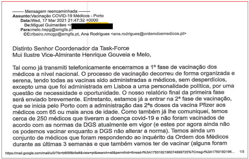 Extracto do e-mail de 17 de Março de 2021 enviado por Miguel Guimarães a Gouveia, admitindo a administração de uma dose “em Lisboa a uma personalidade política, por uma questão de necessidade e oportunidade”.