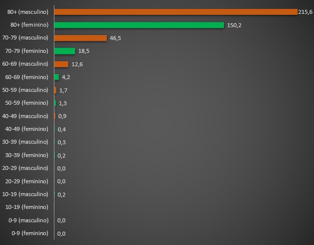 Para esse exercício, não me bastou assim analisar e comparar valores absolutos. Morrer uma pessoa num grupo de 10 é pior do que morrerem 10 num grupo de um milhão. Por isso, além de desagregar os óbitos por covid-19, por grupo etário e sexo (porque o impacte desta doença é muito distinto entre homens e mulheres), procedi a uma padronização. Essa operação permite criar uma taxa de mortalidade, tendo como unidade o número de óbitos por 100.000 habitantes em cada um dos grupos. Isto possibilita assim comparações diacrónicas, entre grupos etários e entre sexos.