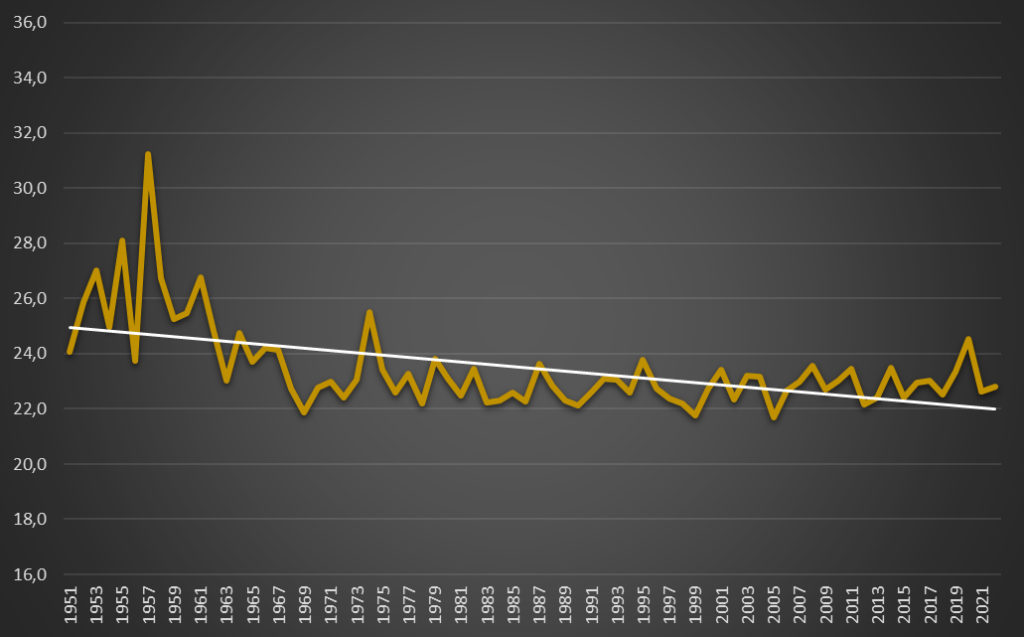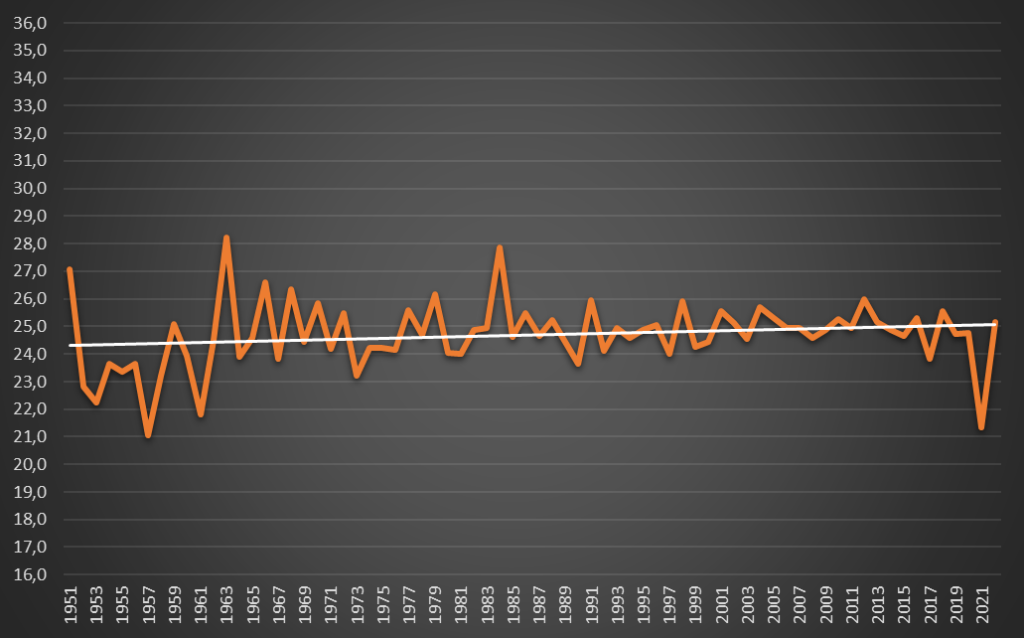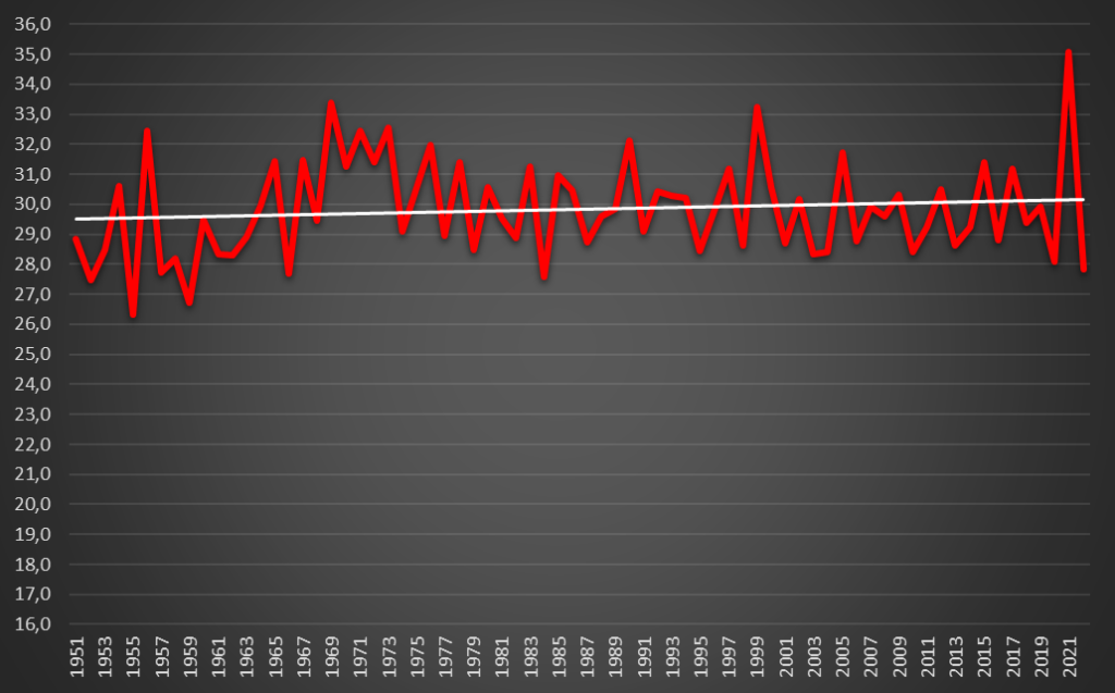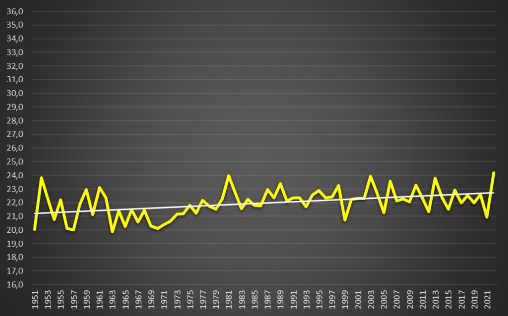 No oposto, o Verão sempre tem sido historicamente a época do ano menos mortal, agregando 22,0% do total dos óbitos registados entre 1951 e 2022 – uma diferença, para menos, de 7,8 pontos percentuais, o que é muito significativo. As variações por decénio não são muito relevantes: 21,5% na década de 1950; 21,1% na década de 1960; 21,4% na década de 1970; 22,5% na década de 1980; 22,3% na década de 1990; 22,6% na década de 2000; e 22,3% na década de 2010. Mesmo estando a falar de grupos populacionais distintos entre 1951 e 2020, não se observa qualquer agravamento em termos médios.
