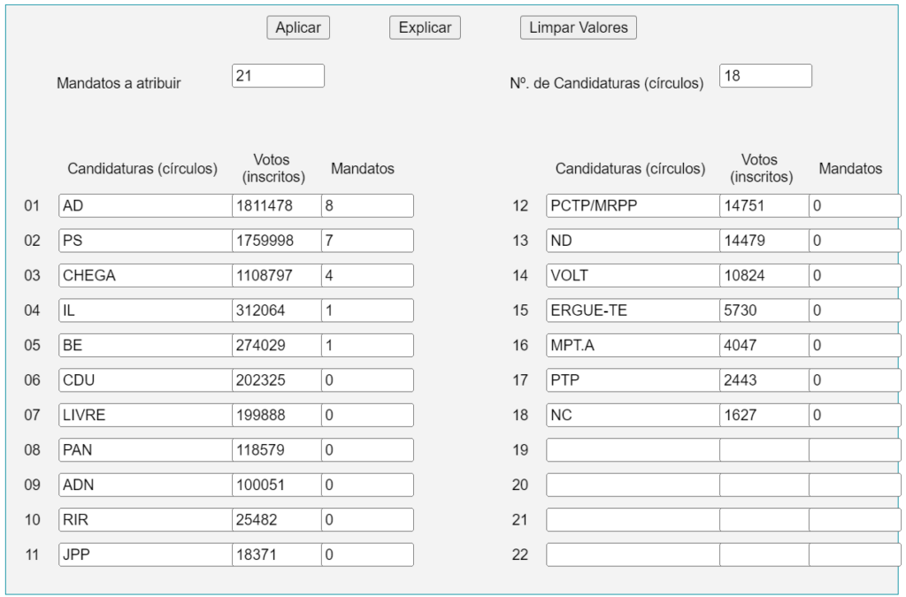 Já a Aliança Democrática, com os 29,49% de domingo passado, ficará com oito deputados, o que se traduz num ganho líquido de apenas um eurodeputado se considerarmos o somatório dos mandatos saídos das eleições europeias de 2019, onde PSD conseguiu seis deputados e o CDS apenas um. Aliás, é neste caso que se mostra a vantagem das coligações (se não forem ‘tóxicas’) em termos de optimização da distribuição dos mandatos pelo método de Hondt: em 2019, se se somarem os votos individualizados de PSD (21,94%) e CDS (6,19%), a razão percentagem por deputado fica em 4,0%, enquanto com os 29,49% – que dariam para oito deputados – essa razão passa para 3,7%.