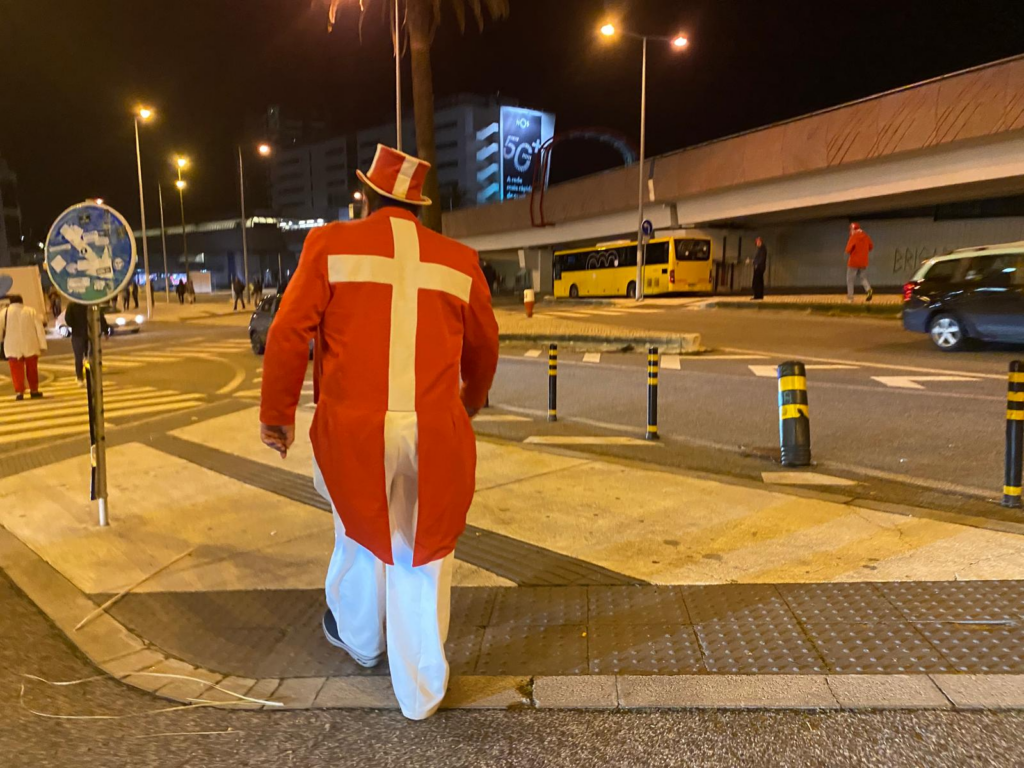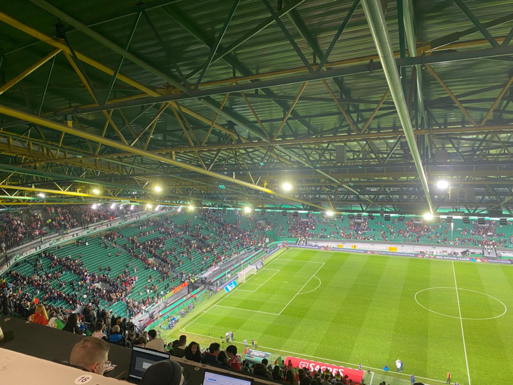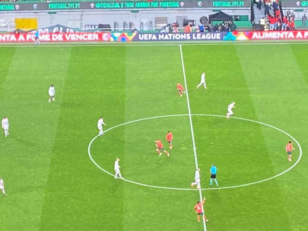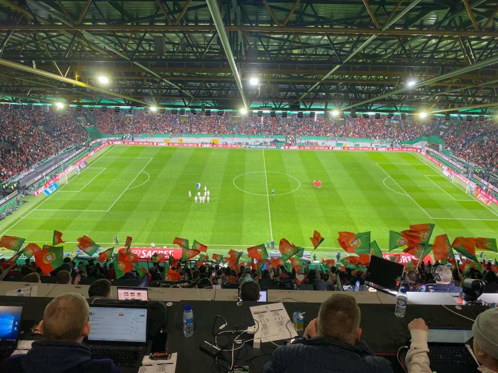 Aproveito para vos revelar que hoje sinto-me um privilegiado aqui nesta varanda, porque, além de o farnel da Federação Portuguesa de Futebol não ser nada mau – uma sandes de carne, um sumo e uma água, um pacote de batatas fritas e um chocolate –, tenho aqui um relato radiofónico em directo, por via dos meus camaradas do lado direito, da FlashScore. Como sou algo pitosga, é uma vantagem saber quem passa e quem remata.