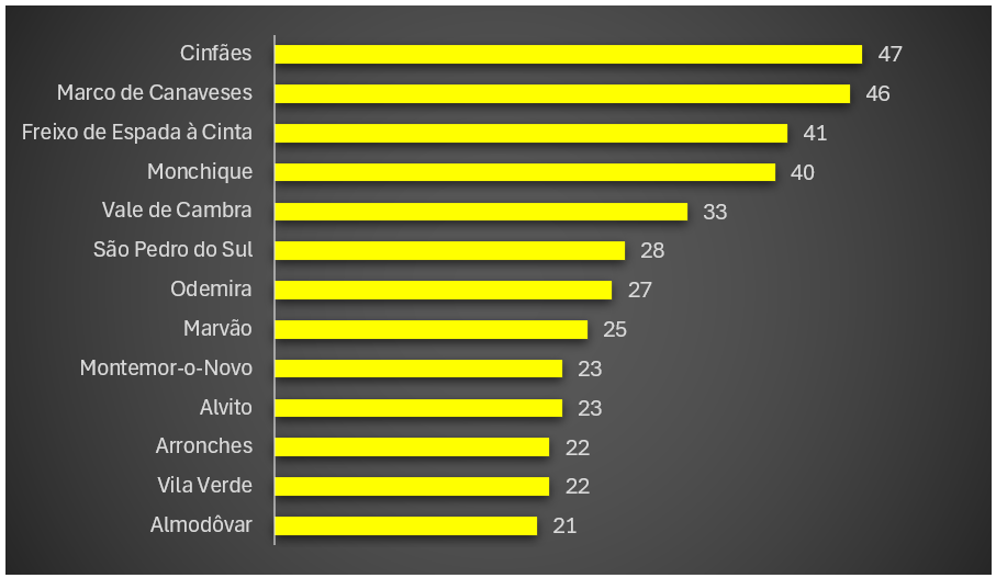 Na região do Norte contabilizam-se cinco concelhos no top dos piores: Cinfães, no distrito de Viseu; Marco de Canaveses, no Porto; Freixo de Espada à Cinta, em Bragança; Vale de Cambra, no distrito de Aveiro; e Vila Verde, em Braga. Os restantes situam-se na região Centro – São Pedro do Sul, distrito de Viseu – e no Algarve – Monchique, no distrito de Faro.