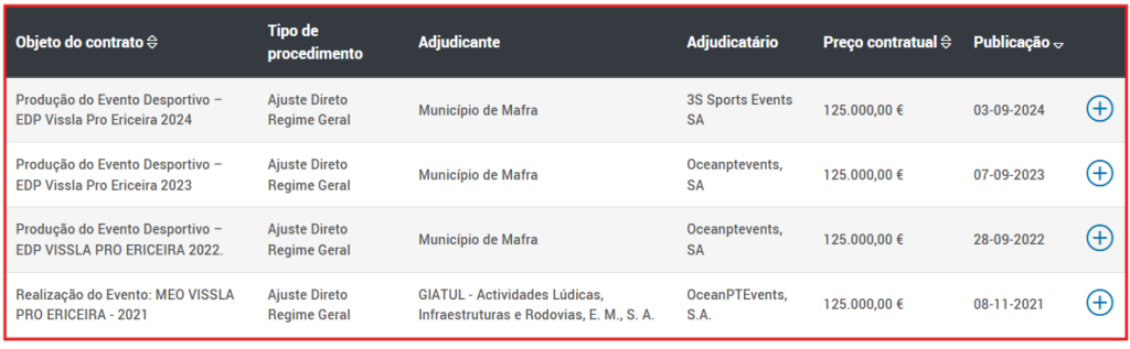 Este ano, o contrato assinado pelo presidente social-democrata da autarquia, Hugo Moreira Luís, em 3 de Setembro passado e registado no Portal Base na mesma data, beneficiou a empresa 3Sports Events e explicita que o objecto é a “Produção do Evento Desportivo – EDP Vissla Pro Ericeira 2024”. Porém, apesar de o contrato estipular que faz parte integrante o caderno de encargos, este documento não se encontra disponibilizado no Portal Base, como deveria. Deste modo, pouco se sabe sobre as tarefas a executar pela empresa contratada, inferindo-se, sem ser evidente, nas cláusulas do contrato que envolverá montagens e desmeontagens de estruturas e também limpeza de espaços. Este procedimento, através de ajuste directo, contrasta com apoios atribuídos por outras autarquias a provas desportivas, mesmo quando sob a forma de patrocínio, onde as contrapartidas estão definidas em detalhe.