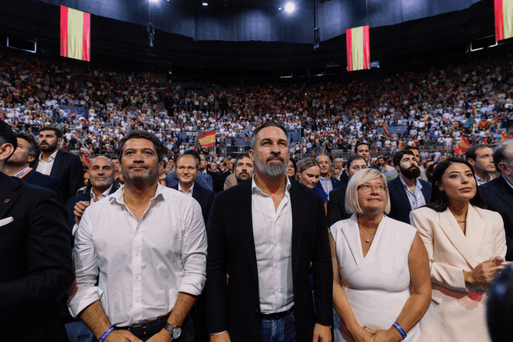 Santiago Abascal, ao centro, líder do Vox, com André Ventura, à esquerda. Foto: D.R.