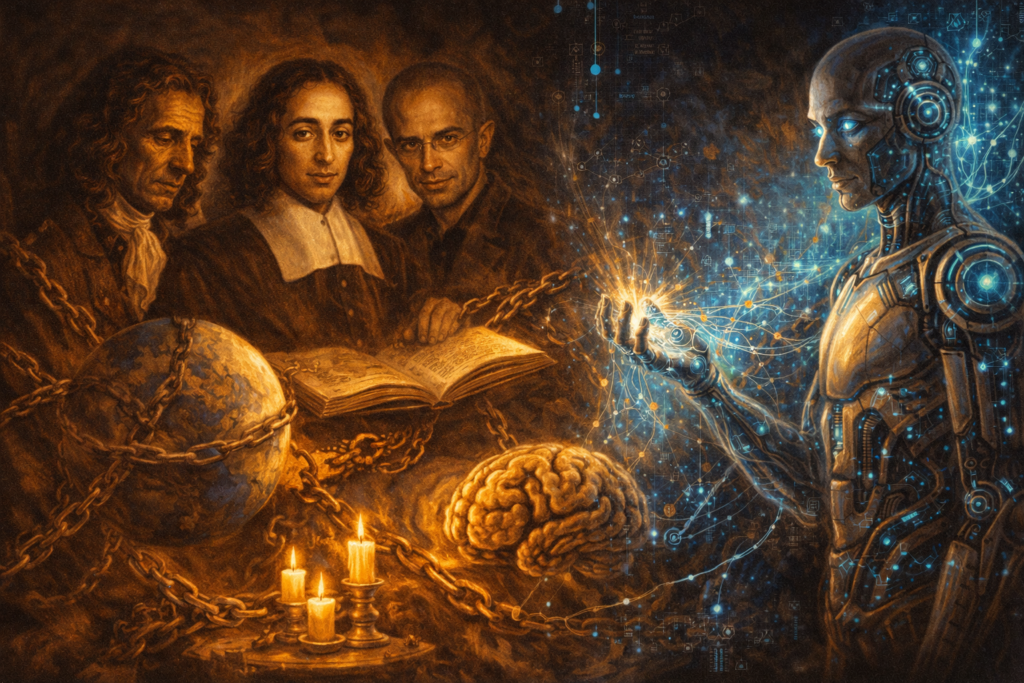 Durante séculos, o determinismo exerceu um fascínio quase hipnótico sobre filósofos e cientistas. A ideia é simples, elegante e tranquilizadora: tudo o que existe — incluindo o ser humano — é o resultado necessário de cadeias causais. Nada poderia ser diferente. A liberdade seria apenas uma ilusão bem contada. Em Baruch Spinoza, esta visão atingiu a sua forma mais pura; em Yuval Noah Harari, ganhou roupagem contemporânea, algorítmica e biologizante.