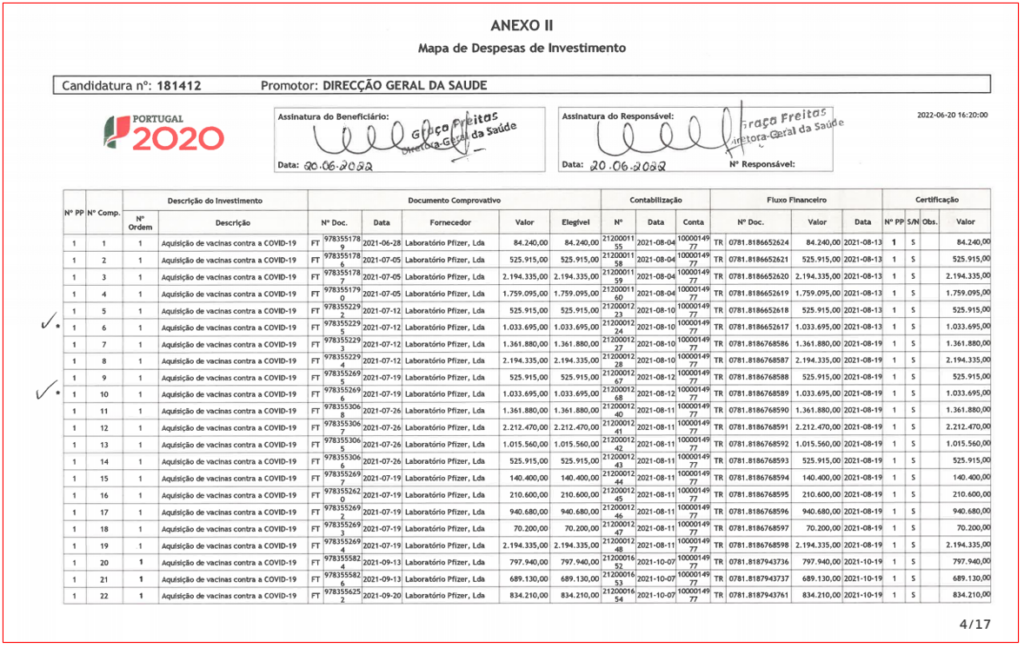 Com efeito, no âmbito de um programa de apoio comunitário para a compra de vacinas, gerido pelo COMPETE 2020, ao qual a DGS recorreu (Candidatura nº 181412 e Contrato nº 2022/181412), encontram-se diversos comprovativos de pagamento de vacinas contra a covid-19 no valor total de 220.723.680,75 euros, sendo que 64 dizem respeito à empresa Laboratório Pfizer Lda. e 64 à Pfizer Biofarmacêutica Sociedade Unipessoal – ambas sucursais da Pfizer –, e ainda 12 à Moderna Biotech Spain, sete à AstaZeneca AB e nove à Janssen Pharmaceutica NY.
