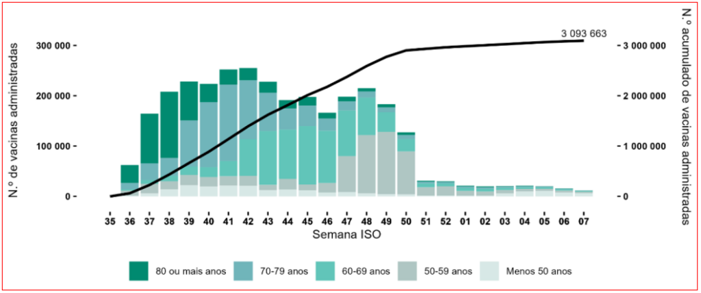 Evolução da administração de doses de vacinas contra a covid-19 por semana por grupo etário. A linha negra representa o número acumulado desde a semana 35 do ano de 2022. Fonte: DGS.