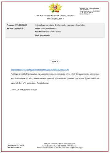 Em consequência, a juíza do processo, Telma Nogueira, exarou um despacho no passado dia 20 de Fevereiro com o seguinte conteúdo: “Notifique a Entidade demandada [Ministério da Saúde] para, em cinco dias se pronunciar sobre o teor do requerimento apresentado pelo Autor [PÁGINA UM] em 06.02.2023, nomeadamente, quanto à existência dos contratos cujo acesso é peticionado nos autos, cf. doc. n.º 1 junto com a Petição Inicial.”