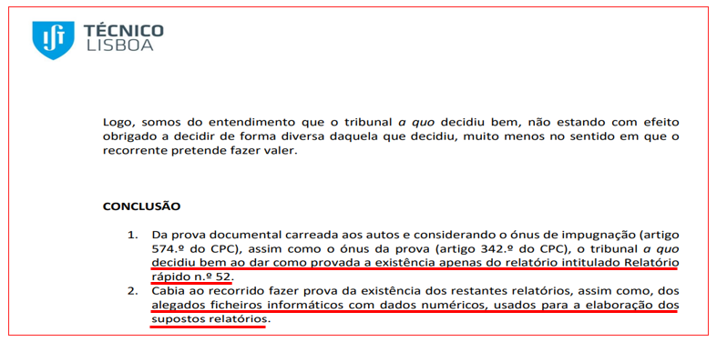 A jurista do IST que assina a contra-alegação, Cláudia Figueira, numa tentativa clara de convencer os juízes desembargadores que irão decidir o recurso de que não existe mais qualquer documento, argumenta que “cabia ao recorrido [PÁGINA UM] fazer prova da existência dos restantes relatórios, assim como, dos alegados ficheiros informáticos com dados numéricos, usados para a elaboração dos supostos relatórios.” E que não terá provado.