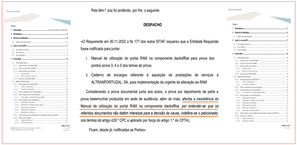 Em acta, a juíza escreveu o seguinte: ”Considerando a prova documental junta aos autos, a prova por depoimento de parte e prova testemunhal produzida em sede de audiência, além do mais, aferida a inexistência do Manual de utilização do portal RAM na componente backoffice, por entender-se que os referidos documentos [manual e caderno de encargos do Portal RAM] não detêm interesse para a decisão da causa, indefere-se o peticionado, nos termos do artigo 429.º CPC e aplicado por força do artigo 1.º do CPTA).”
