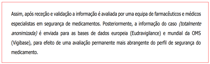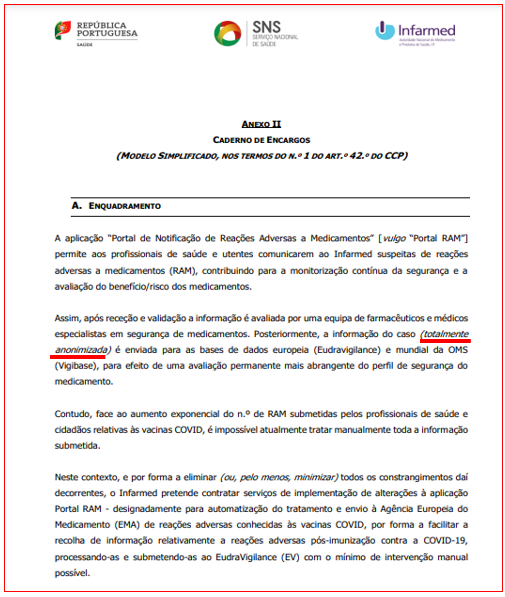 Nesse documento anexo ao contrato com a Altran explicava-se também que o Portal RAM “permite aos profissionais de saúde e utentes comunicarem ao Infarmed suspeitas de reações adversas a medicamentos (RAM), contribuindo para a monitorização contínua da segurança e a avaliação do benefício/ risco dos medicamentos”, e que “assim, após receção e validação a informação é avaliada por uma equipa de farmacêuticos e médicos especialistas em segurança de medicamentos”, sendo que, “posteriormente, a informação do caso (totalmente anonimizada) é enviada para as bases de dados europeia (Eudravigilance) e mundial da OMS (Vigibase), para efeito de uma avaliação permanente mais abrangente do perfil de segurança do medicamento”.