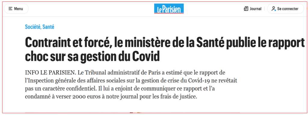 Notícia do Le Parisien de quinta-feira, actualizada hoje, revelando a vitória nos tribunais para acesso a uma auditoria escondida pelo Ministério da Saúde de França sobre a gestão da primeira fase da pandemia.