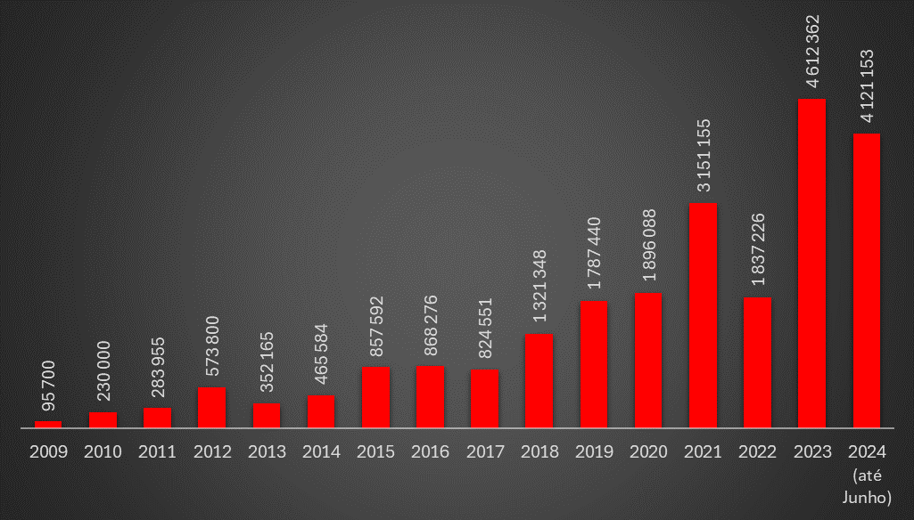 Evolução dos montantes (em euros) dos contratos públicos da EY desde 2009 por data de celebração. Valores de 2024 dizem respeito aos contratos já publicitados até 26 de Junho. Fonte: Portal Base.