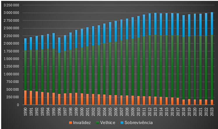 Evolução do número de pensões de invalidez, de velhice e de sobrevivência entre 1990 e 2023. Fonte: INE.