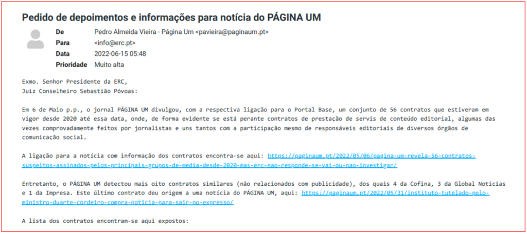Por fim, em Julho passado, no âmbito de um conjunto de deliberações da ERC sobre contratos promíscuos entre empresas de media e entidades públicas, envolvendo “jornalistas comerciais”, o Conselho Regulador da ERC decidiu pespegar nos documentos que a sua acção tinha sido por via de uma minha exposição, quando, na verdade, aquilo que se solicitara ao regulador, cerca de um ano antes, fora tão-só um “pedido de depoimentos e informações para notícia do PÁGINA UM”. Sobre isto, escrevi em Julho, um editorial apropriadamente intitulado “Ao pântano, a ERC adiciona a pulhice”. Talvez me valha mais um processo judicial, talvez mais outro que, depois de fazer ganhar mais uns cobres a advogados, me manda retirar.