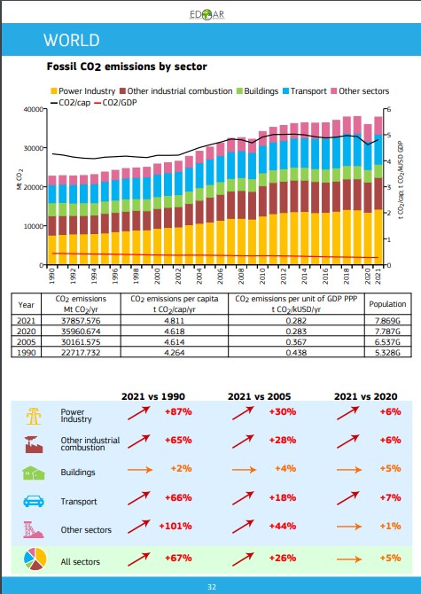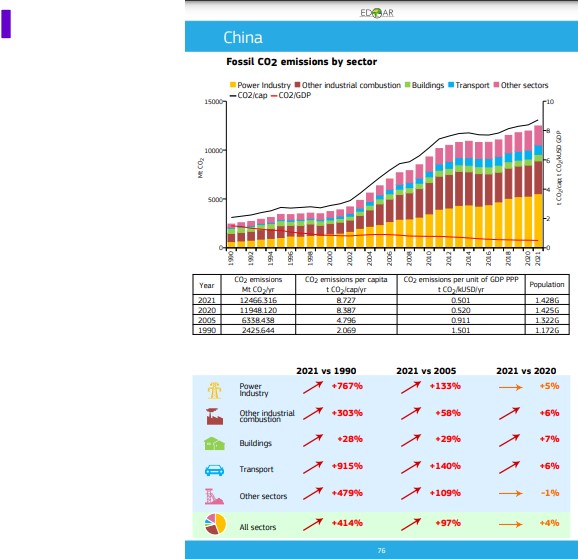 Assim, em 1990, a China – que detinha cerca de 20% da população mundial – emitia apenas 2.425 MtonCO2, ou seja, pouco mais de 10% do total mundial de gases com efeito de estufa. Com o repentino crescimento económico – mas assente em reduzida eficiência energética, sobretudo por causa da queima de carvão e de alguma tecnologia obsoleta –, a China não cresceu apenas economicamente: as suas emissões de dióxido de carbono mais do que quintuplicaram desde 1990, passando para 12.466 MtonCO2 em 2021. Representam já 32,9% do total mundial; é mais de quatro vezes a quantidade emitida pelos países da União Europeia. E é 329 vezes mais do que as emissões de Portugal.