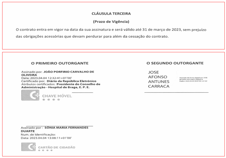 E, por fim, ironicamente, o quarto contrato diz respeito a mais um ajuste directo à ITAU, a empresa de fornecimento de refeições que assinou 11 contratos por ajuste directo com o Hospital de Santo António, conforme ontem o PÁGINA UM revelou. Mas no caso do contrato no valor de 645.191,67 euros (não são trocos) com o seu hospital, o matemático João Porfírio conseguiu uma impossibilidade “física”: assinou ele próprio (com a sua colega da administração Sónia Duarte) no dia 4 de Abril de 2023 um contrato que, na cláusula terceira, diz tão-só o seguinte: “O contrato entra em vigor na data da sua assinatura [portanto, 4 de Abril de 2023] e será válido até 31 de março de 2023, sem prejuízo das obrigações acessórias que devam perdurar para além da cessação do contrato“.