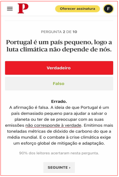 Das 10 perguntas, apenas errei – na concepção do Público – esta pergunta, e o jornal “explica” porquê. Diz que “a ideia de que Portugal é um país demasiado pequeno para ajudar a salvar o planeta ou ter de se preocupar com as suas emissões não corresponde à verdade. Emitimos mais toneladas métricas de dióxido de carbono [tonCO2] do que a média mundial. E o combate à crise ambiental exige um esforço global de mitigação e adaptação”.