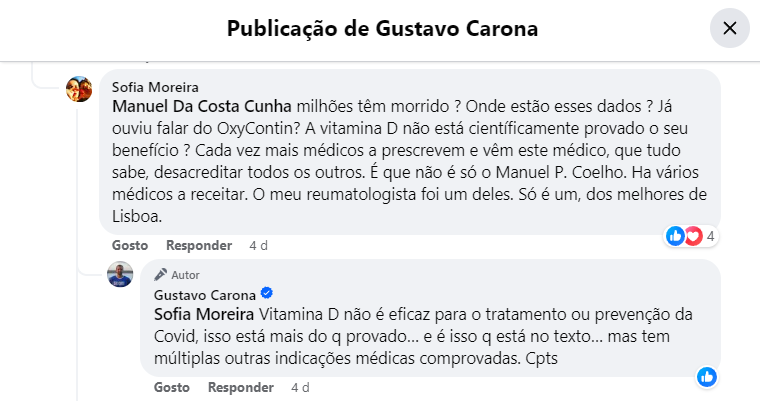 Mas voltemos à vitamina D, até porque, esta semana, na sua página do Facebook, fez ainda o seguinte comentário a uma leitora, à laia de dogmática sentença, como é seu hábito: “Vitamina D não é eficaz para o tratamento ou prevenção da Covid, isso está mais do q[ue] provado… e é isso q[ue] está no texto… mas tem múltiplas outras indicações médicas comprovadas”.